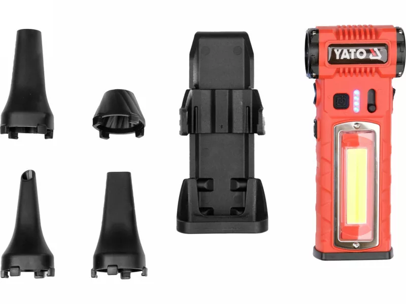 Zariadenie je vybavené dvomi svetelnými zdrojmi: bodovým a plošným, s niekoľkými svetelnými režimami, čo zvyšuje jeho funkčnosť v podmienkach obmedzenej viditeľnosti. V bočnej časti obalu sa nachádza integrovaná čepeľ umožňujúca rýchle rezanie plastových pásov. Zospodu sú umiestnené štyri magnety, vďaka ktorým je možné dmychadlo jednoducho pripevniť na kovové povrchy, čo je obzvlášť praktické pri servisných prácach, napríklad pri opravách automobilov.