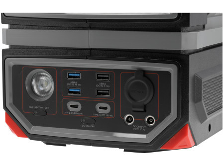 Prenosné batérie napájané zdroj s kapacitou 504 Wh. Je schopný napájať až jedenásť zariadení súčasne. Vestavany čistý sinus AC menič 600 W (vrcholový výkon 1200 W) môže slúžiť ako núdzový zdroj energie pre centrálne kúrenie, čerpadlo kotla, kontroler, smerovač, notebook, väčšinu stolných počítačov a mnoho ďalších zariadení. Má šesť USB portov, z toho dva USB-A s technológiou Q.C, max. 18 W, a dva USB-C porty PD 60 W a PD 100 W, ktoré sú schopné nabíjať a dobíjať smartfóny, tablety alebo notebooky. 12-voltová zásuvka môže úspešne napájať turistickú chladničku alebo špeciálne svetlo. Dve 12 V jack zásuvky môžu napríklad udržiavať akumulátor vozidla pod napätím počas nabíjania.