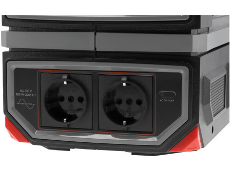 - Trvalý výkon z AC 230 V zásuvok: 600 W (vrchol 1200 W)
