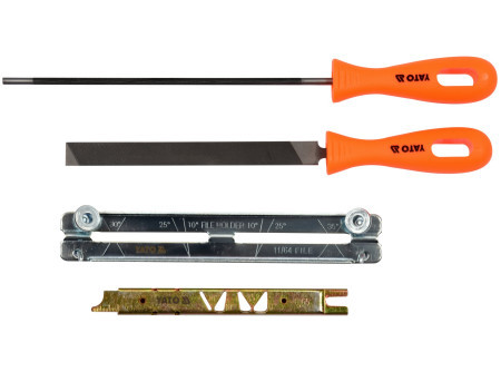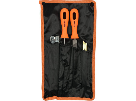 Négy darabból álló készlet, melyet láncfűrészvágók élezésére használnak. A készlet tartalmaz: